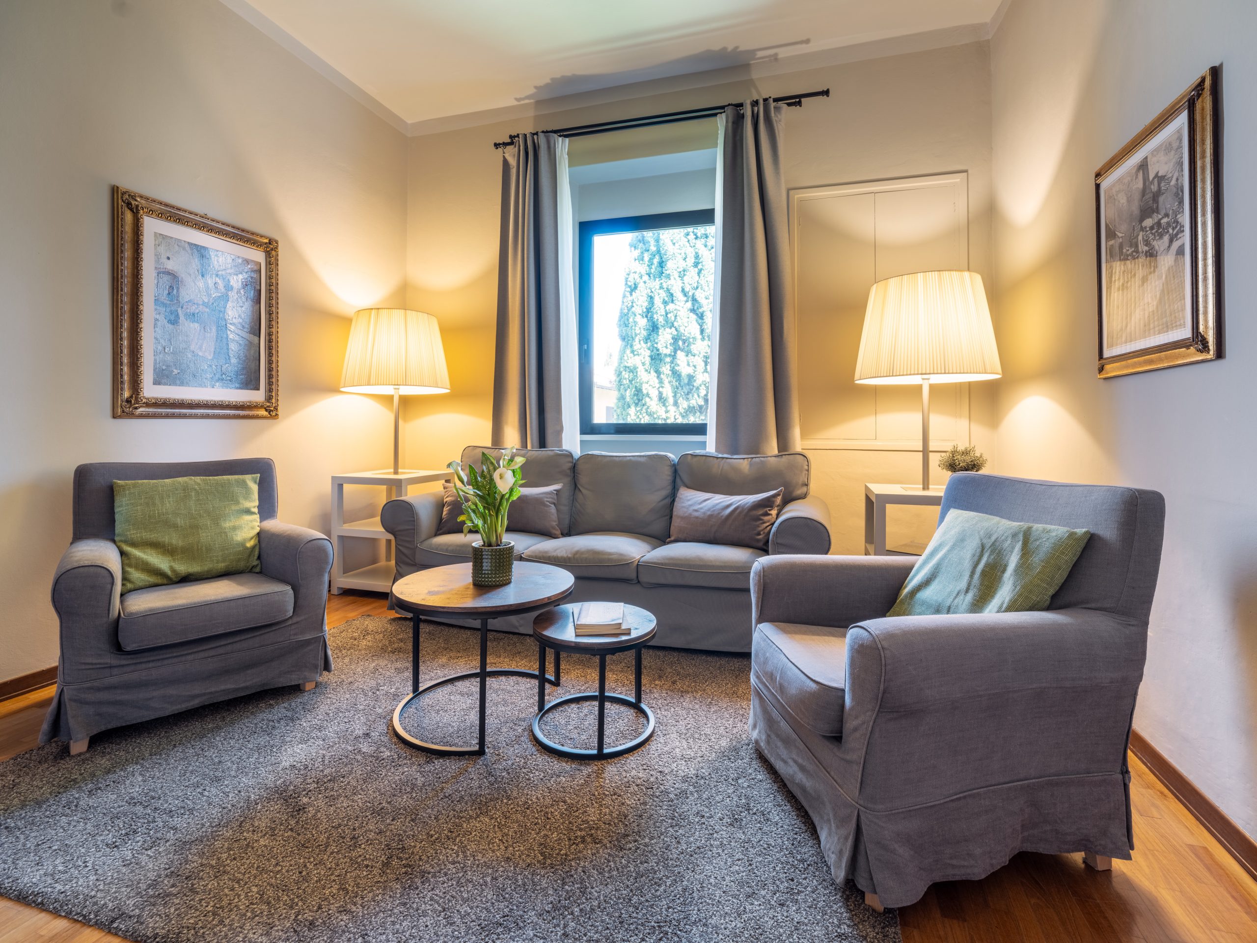 Family Suite located on first floor with: living room with kitchenette, 3 double rooms, 2 bathrooms with shower, small outside area with table and chairs 3 meters from the Suite.